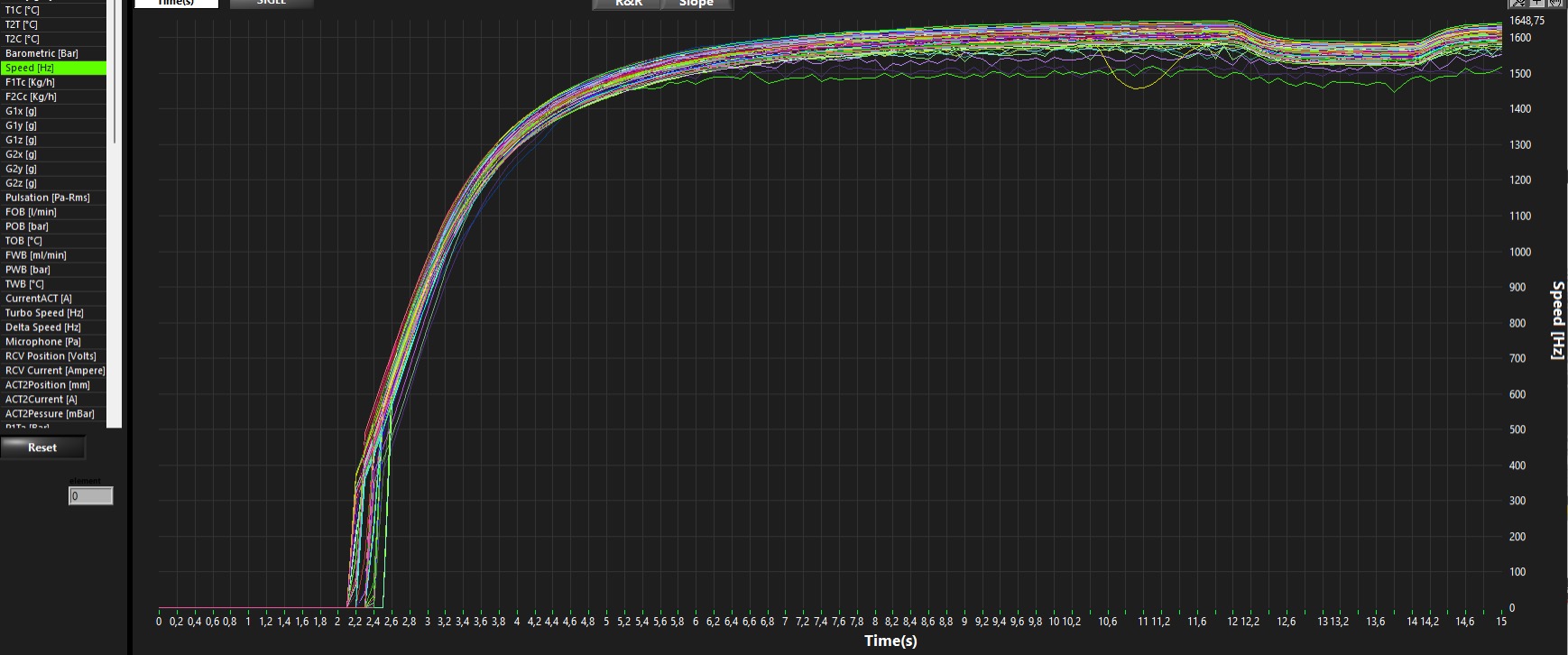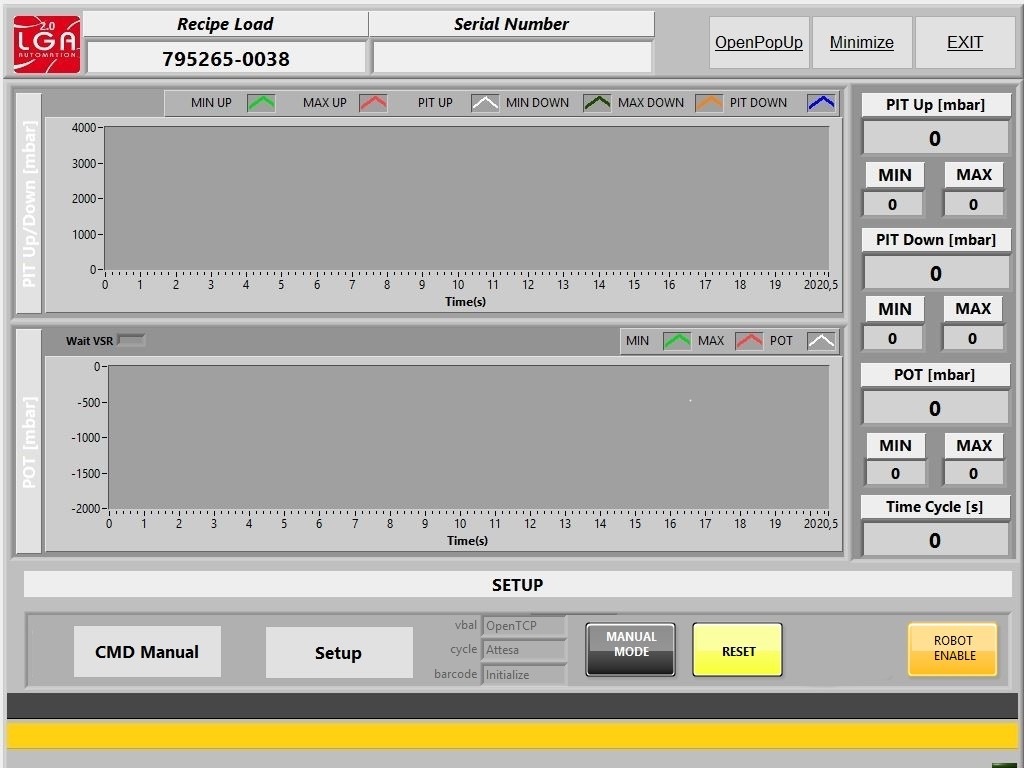 Un test preliminare verifica l’operatività delle varie valvole sia pneumatiche che elettriche che pilotano l’EGR e la geometria variabile. Il prodotto oggetto di prova viene poi alimentato con olio motore a 55°C per la lubrificazione degli organi rotanti e alimentato con aria a 50°C e pressione variabile tra 0 e 2 bar.